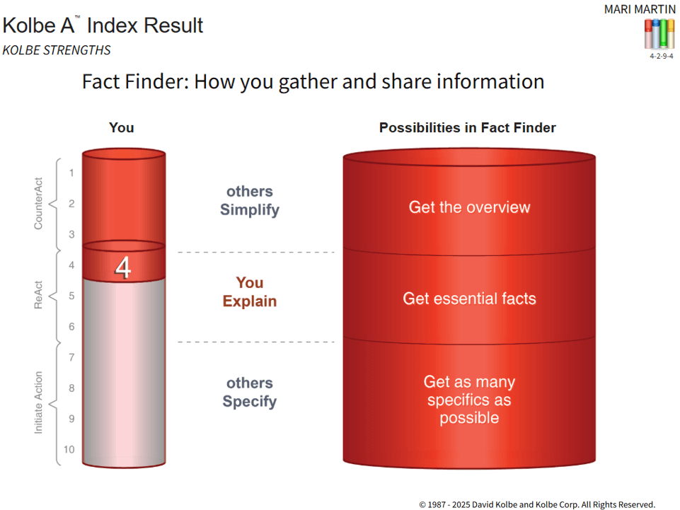 This is why knowing your Kolbe A™ Index—and understanding it deeply—is so powerful. Kolbe describes the verbs about you and it’s in the verbs that work and life happen. When you apply it intentionally across your work and your life, it places the power of decision-making squarely in your hands. Anxiety subsides because you are now in control, instead of “it” controlling you. This simple awareness can transform anxiety into well-being.